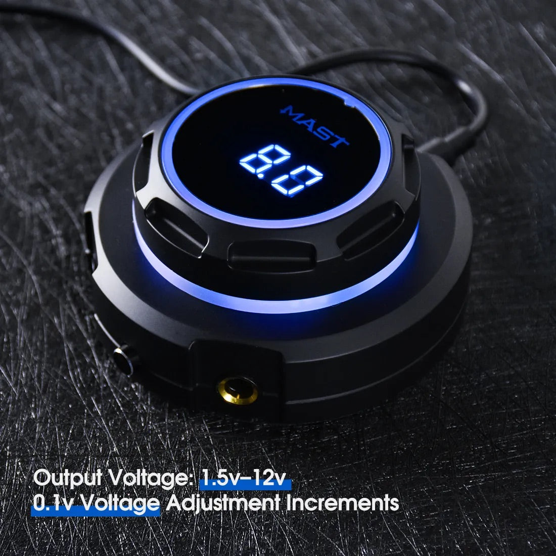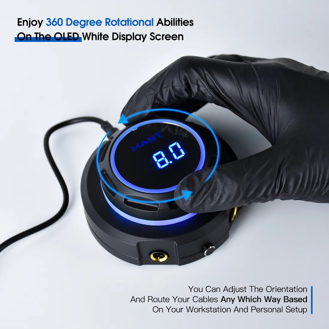 استمتع بالوشم الفعال على مستوى الذروة مع مصدر الطاقة Mast Halo Tattoo. جهد الخرج: 1.5 فولت - 12 فولت؛ زيادات تعديل الجهد 0.1 فولت. تم تصميم Mast Halo ليدوم طويلاً، ويلبي متطلباتك، ويجعل عملك أسهل. استمتع بقدرات الدوران 360 درجة على شاشة العرض البيضاء OLED؛ هذا يعني أنه يمكنك ضبط الاتجاه وتوجيه الكابلات الخاصة بك بأي طريقة بناءً على محطة العمل الخاصة بك والإعداد الشخصي. متوافق مع اللفائف التقليدية والآلات الدوارة.
